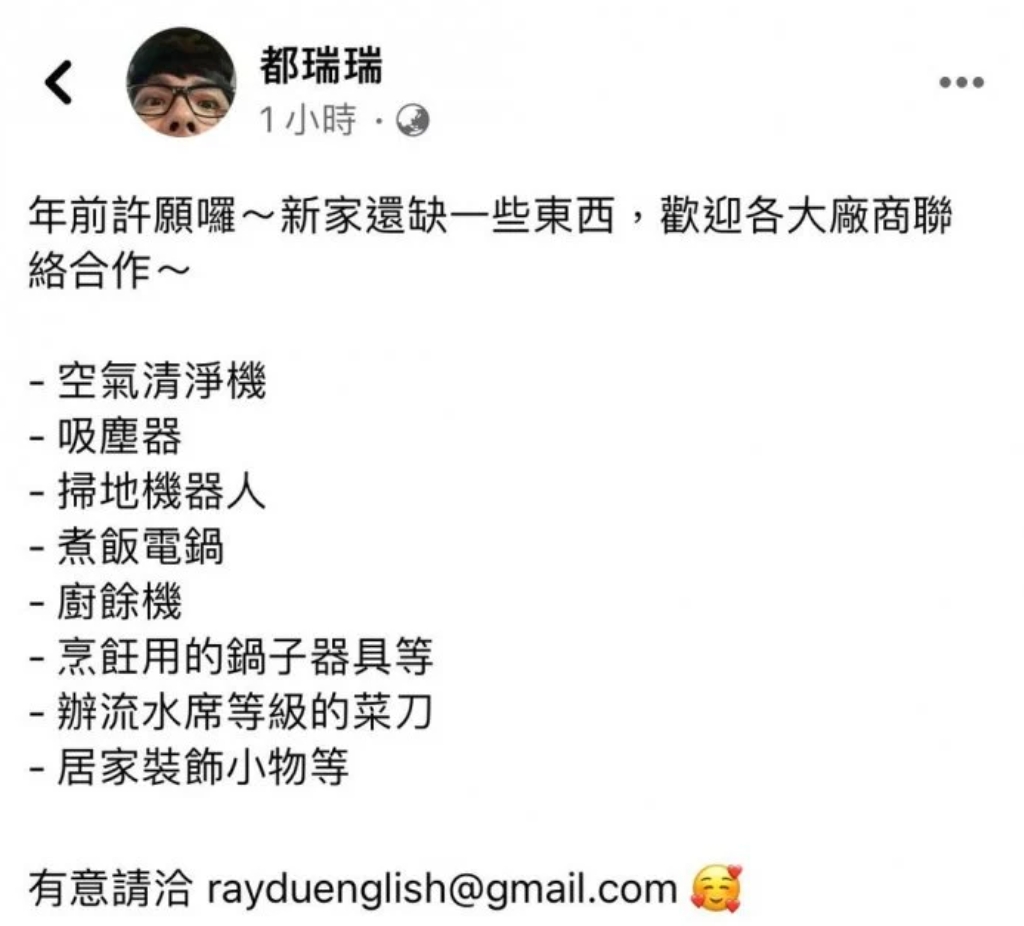 阿滴日前在臉書發文表示:「年前許願囉~新家還缺一些東西,歡迎各大廠商聯絡合作~」並詳細列出需要的東西,其中包含空氣清淨機、吸塵器、掃地機器人、電鍋、廚餘機,以及一些廚房用品等,總共列了8項商品。
