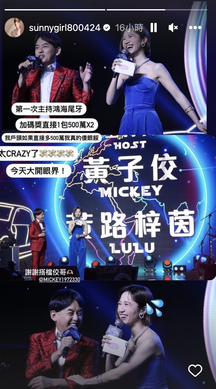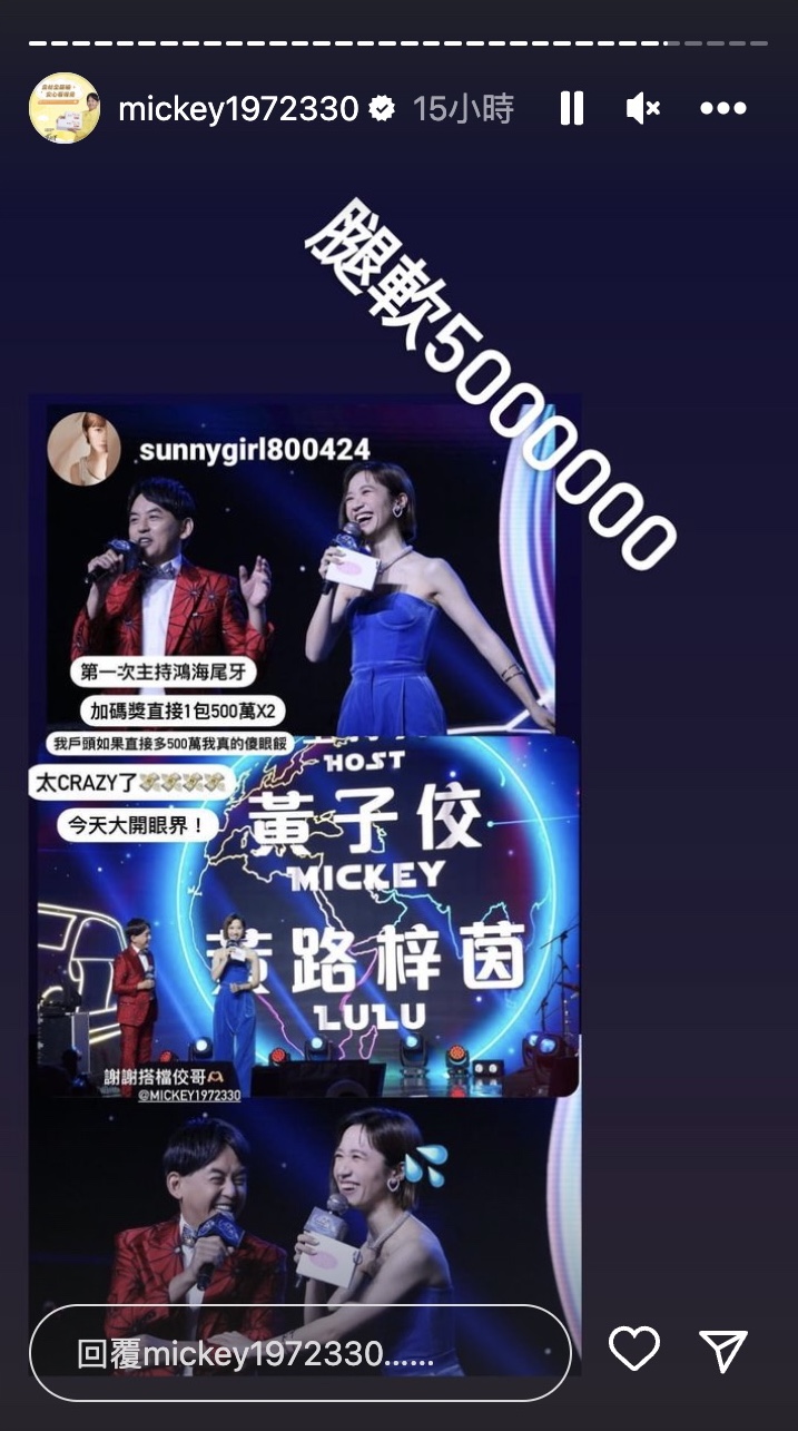 此外,Lulu在聽到鴻海現場公布加碼獎金之後,她也震驚的在限動中直呼,「我戶頭如果直接多500萬,我真的傻眼餒!太Crazy了!」而黃子佼事後也轉發這則限時動態並表示,「腿軟5000000!」可以感受到師徒兩人對於這筆加碼金額是有多麽震撼。