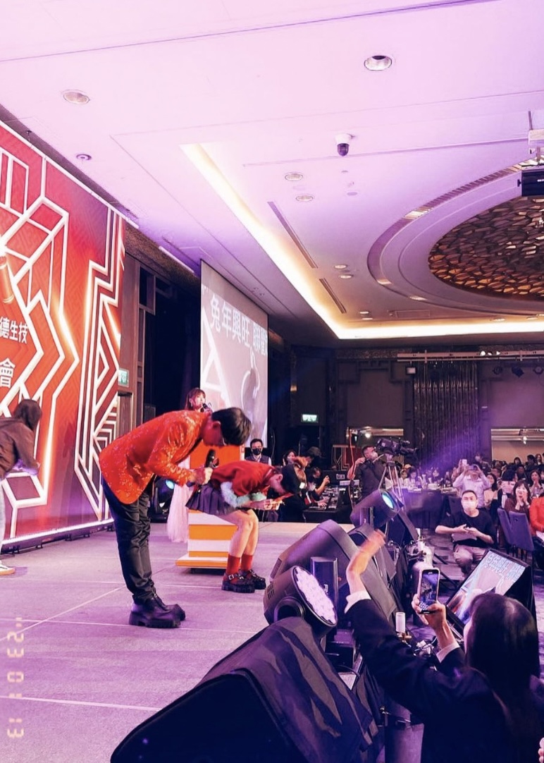 從Lulu的限時動態中可以看到,這是她第一次主持鴻海尾牙,頂著一頭俐落短髮,搭配高雅的寶藍色連身褲裝,襯得她的肌膚更加白皙,而腰身的剪裁與設計,也讓她的體態顯得更加凹凸有致,率性的褲裝依然能讓她展現滿滿的女人味!而Lulu也趁著魚丁糸在台上表演時,在台下跟著一起高歌,整個人沈醉在魚丁糸的演出裡。