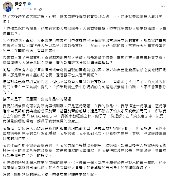 不僅如此,黃豪平在內文中表示:「不『試圖』客觀,怎能知道你的主觀與眾不同?創作最忌『理所當然』。」高EQ的回覆立刻獲得網友的力挺,「喜劇公道伯非你莫屬」、「我倒是滿喜歡豪平用喜劇的方式,讓觀眾反思一些事情的看法」、「好愛你每次都能這麼有智慧的回應」。