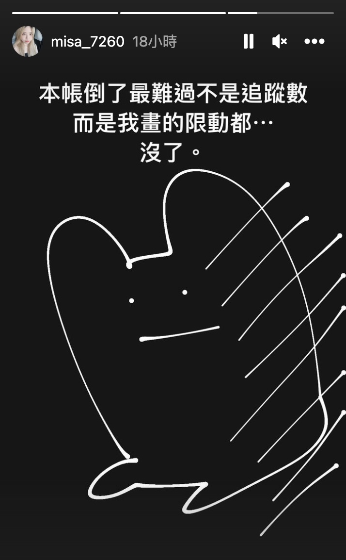 米砂也無奈地透露,「最難過的不是追蹤數,而是我畫的限動都...沒了!」因為米砂平常都喜歡畫一些插畫透過限動來跟大家分享心情,而且她也非常勤勞的更新限動,讓不少粉絲看了都覺得她的畫非常生動可愛,也吸引了不少新粉絲的關注,可如今本帳被封鎖,讓她過往的所有插畫限動全都不見,讓她想當難受。