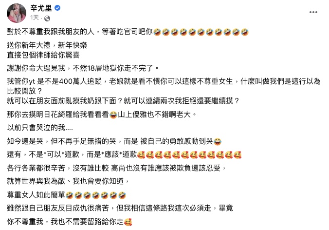 辣模辛尤里在20日透過臉書控訴自己遭到「400萬追蹤數的Youtuber」亂摸下體、胸部,決定不再忍氣吞聲,要找律師提告對方!雖然她並沒有直接點名對象是誰,但事後Youtuber葉式特工也自己發文曬出他跟辛尤里的對話截圖,透露兩人原本在私底下就會做類似的互動,無法接受對方突然翻臉還控訴他伸出鹹豬手,並表示,「妳怎麼還可以隔天上午叫我再回飯店想跟我見面?這是正常被豬伸鹹手後對豬的反應?」掀起熱烈關注與討論。