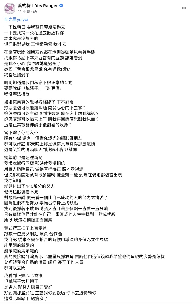 而葉式特工到了飯店後發生什麼樣的事,他則透露,辛尤里的朋友當時從頭到尾就在旁邊滑手機,「我跟你私底下本來就會有的互動讓她看到,是我不小心,我也跟她道過歉了!她回『我會跟尤里說你有道歉(讚)』我當是接受了」。葉式特工也表示,「明明知道是我們私底下很正常的互動,硬要說成『鹹豬手』、『吃豆腐』,我沒辦法接受!」