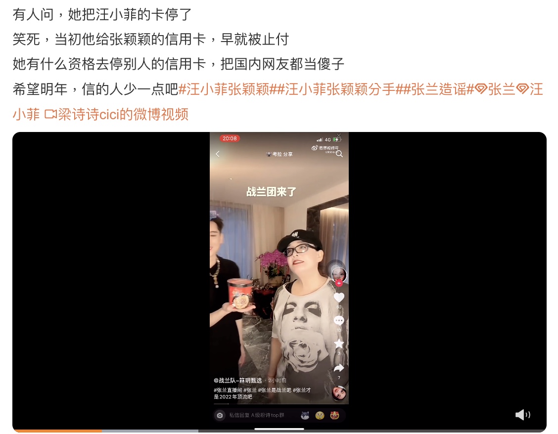 中國女星張穎穎跟汪小菲近日鬧分手,女方在16日透過微博公開汪小菲跟她求和的對話截圖,並冷冷地表示,「好好聽你媽媽的話吧!」不過,沒多久之後,張穎穎也刪除了貼文,後來又傳出雙方已經和好,兩人間的感情狀況讓網友們看了都覺得霧煞煞。而張蘭近日在直播時也氣到跟網友宣告「要停掉汪小菲的卡」,似乎是相當不滿張穎穎一直花汪小菲的錢,掀起網友高度關注與討論!