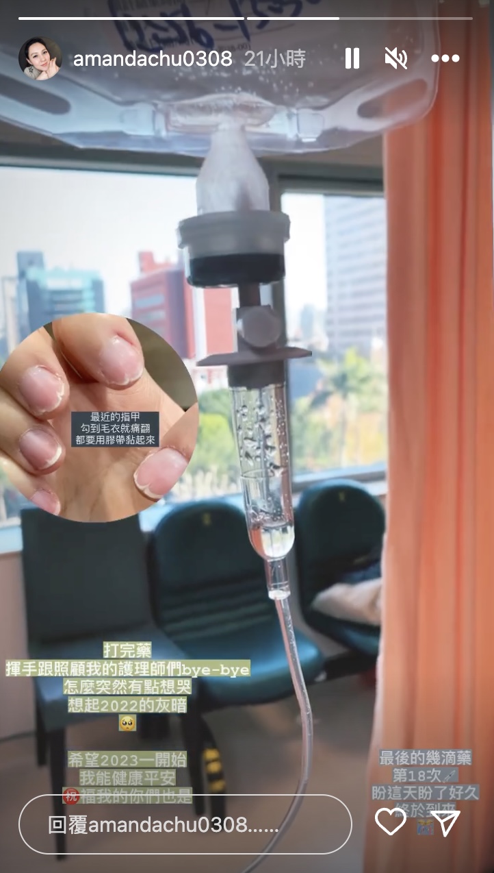 此外,朱芯儀也正向的表示,「希望2023一開始,我能健康平安,祝福我的你們也是!」而從限動中也可以看到她的點滴剩下沒多少的藥,「最後的幾滴藥,第18次,盼這天盼了好久,終於到來!」讓不少粉絲們看了都替她感到開心。