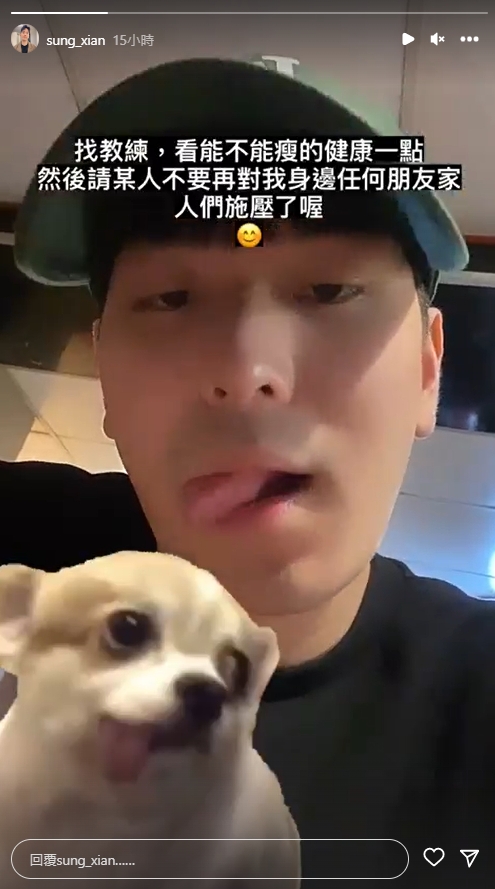 宋晉賢31日在IG限時動態發布一則自拍影片,只見他學著濾鏡中的吉娃娃扮鬼臉吐舌,表情看上去有點無奈,並透露最近想要找健身教練上課,用健康的方式減重,隨後話鋒一轉,突然開嗆:「請某人不要再對我身邊任何朋友家人們施壓了喔!」雖然沒有指名道姓,但根據過往曾與小甜甜多次隔空交戰,似乎就是在意指前妻。