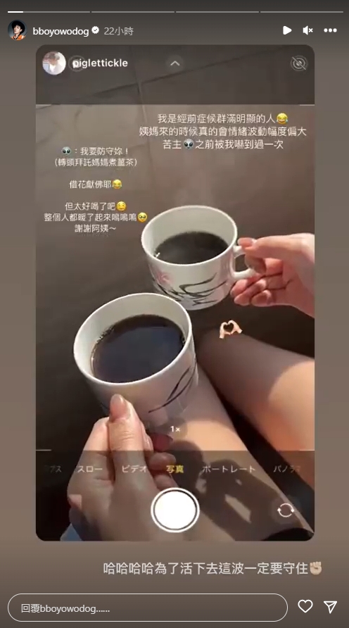 敖犬在過年前曾透露發發因為要上班,所以不會一起過年,如今終於等到女方休假,他31日帶著發發一起回台中的老家吃飯,恰巧碰到生理期來,發發表示:「姨媽來的時候真的會情緒波動幅度偏大,苦主之前被我嚇到過一次。」敖犬為了體貼女友,所以特地拜託媽媽煮薑茶,發發笑說是「借花獻佛」,也很感謝阿姨的照顧,「整個人都暖了起來!」敖犬隨後轉發該動態並開玩笑說:「為了活下去,這波一定要守住!」