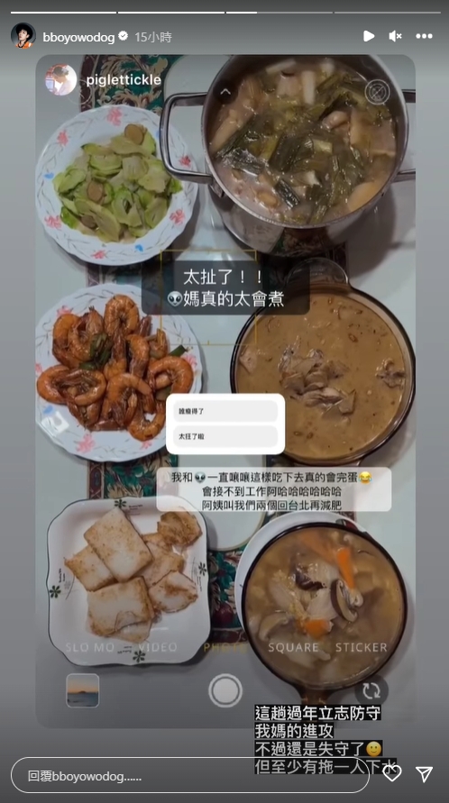 不僅如此,敖犬媽媽精心準備了六道佳餚,有菜、有肉十分豐盛,發發見狀都驚呼:「太扯了!敖犬媽真的太會煮!」原本一直嚷嚷吃下去會「完蛋」,還會因此接不到工作,「阿姨叫我們兩個回台北再減肥」,敖犬也說:「這趟過年立志防守我媽的進攻,不過還是失守了,但至少有拖一人下水。」互動相當可愛。