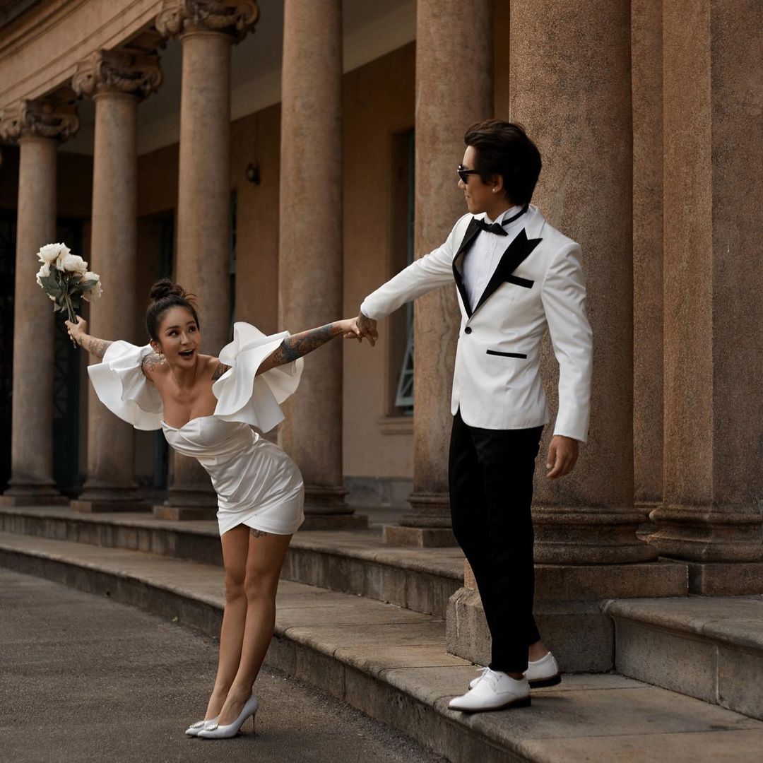梁云菲的男友在社群上PO出一系列的婚紗照,從照片中可以看到,梁云菲梳起了俐落的髮型,頭上別了白色的頭紗,身上穿著短版的緞面洋裝,V字剪裁的設計也非常有巧思,讓她露出了性感的半球以及修長的美腿,雖然有幾張照片是穿著洋裝搭配平底布鞋,但看起來整體的身材比例非常好!