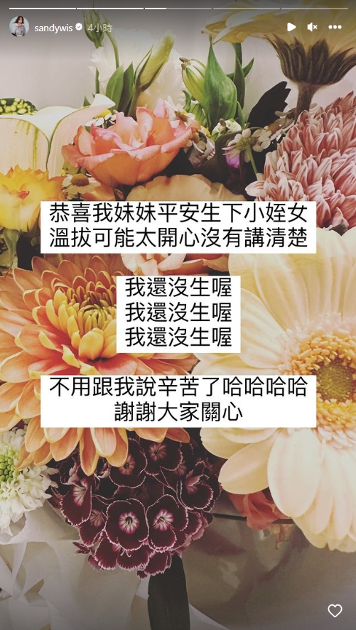 不過,這名孫子其實是二女兒的孩子,但因為吳宗憲的貼文沒有特別說明,所以不少人誤以為是大女兒吳姍儒順產,所以紛紛私訊祝福她。對此,吳姍儒3日在IG發文表示:「恭喜我妹平安生下小姪女,溫拔(我爸)可能太開心沒有講清楚。」接著便連說三次「我還沒生喔」,所以不用跟她說「辛苦了」,也很謝謝大家的關心。