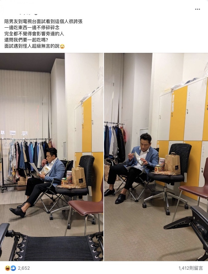 近日一名女網友在臉書「爆怨公社」發文附上照片並表示,「陪男友到電視台面試看到這個人很誇張,一邊吃東西一邊不停碎碎念!完全都不覺得會影響旁邊的人,還問我們要一起吃嗎?面試遇到怪人超級無言的說...」最後還附上一個翻白眼的貼圖,可以感受得到該名女網友當下相當困擾。