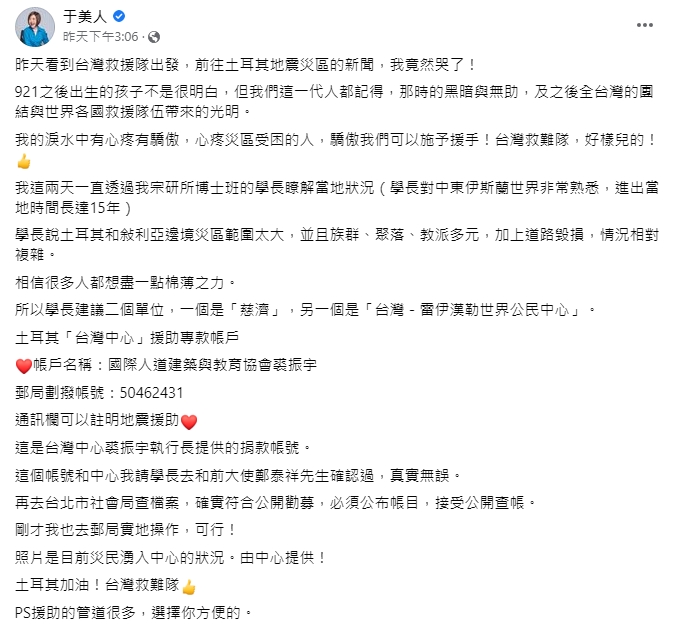 于美人8日在臉書表示:「昨天看到台灣救援隊出發,前往土耳其地震災區的新聞,我竟然哭了!」這次的事件讓她回想起台灣在民國88年發生過921大地震,「我們這一代人都記得,那時的黑暗與無助,及之後全台灣的團結與世界各國救援隊伍帶來的光明。」她的淚水中有心疼、有驕傲,「心疼災區受困的人,驕傲我們可以施予援手!」