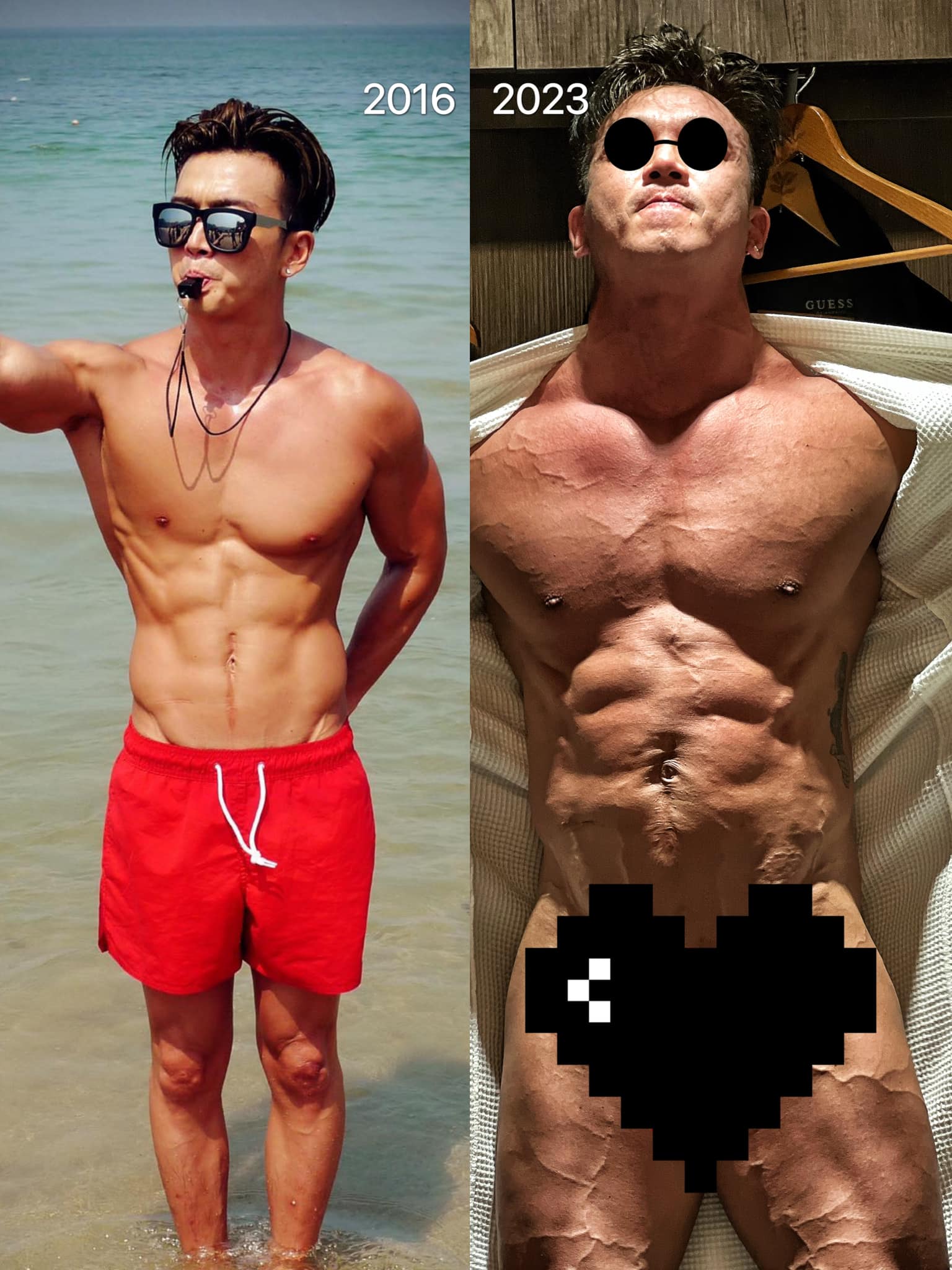 此外,先前因為有網友直指李沛旭拍照都不敢拍下半身,是因為他都沒練腿,「李沛旭腿很細」、「李沛旭鳥仔腳」等負面評論,讓他在1日曬出全裸照反擊,畫面中可以看到他將浴袍大喇喇地攤開,露出壯碩的身材及塊塊分明的六塊肌,同時還能發現大腿上也冒出青筋,看起來相當粗壯,至於重要部位則僅用了18禁的圖案遮掩,明顯是想向大家證明自己都有在鍛鍊下半身,掀起熱議。