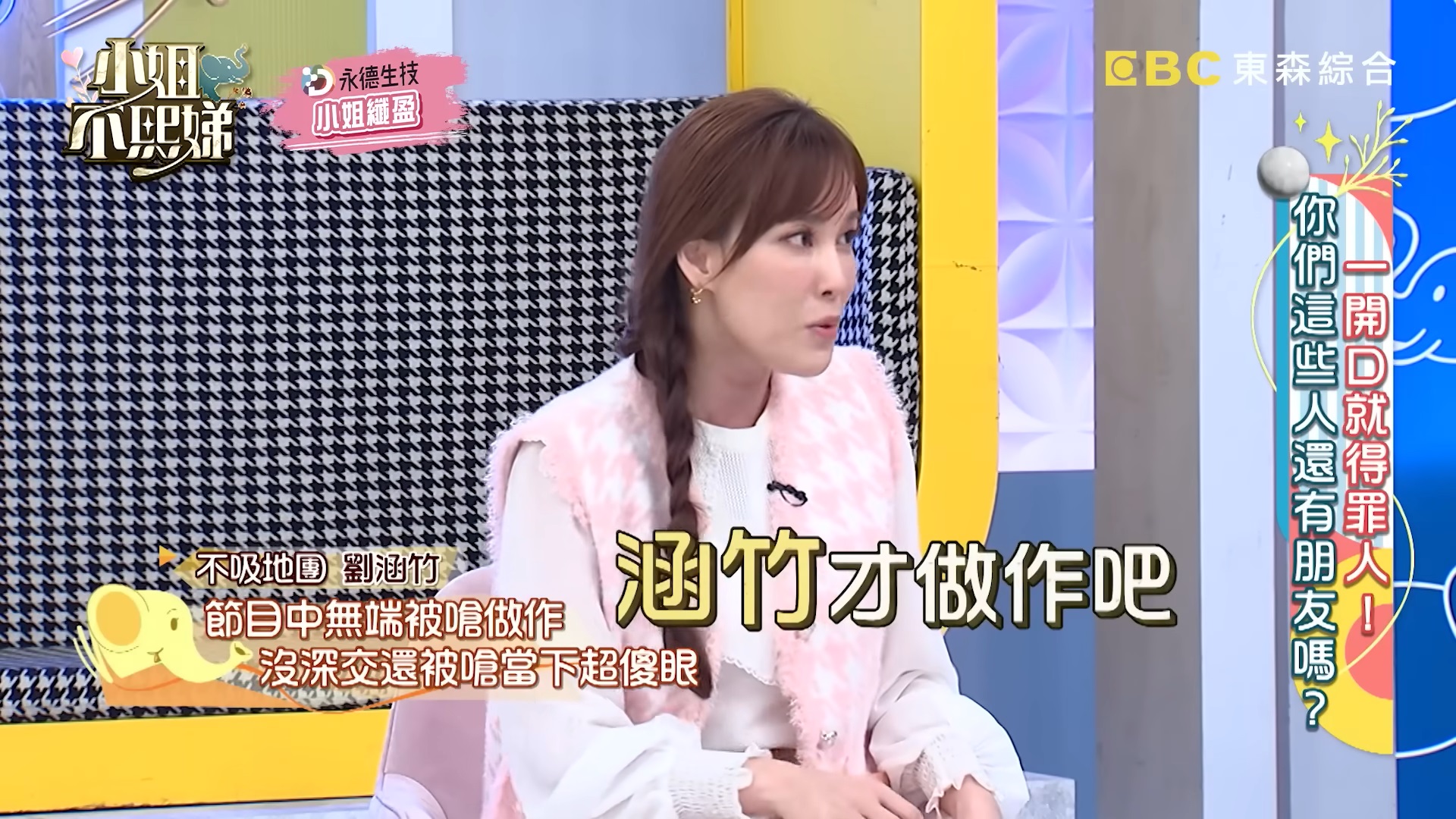 劉涵竹透露日前錄《不熙娣》時,為了讓來賓多講話,所以忍痛放棄準備兩個小時的故事,怎料節目進行到尾聲時,竟突然被來賓劉伊心嗆:「涵竹才做作吧!」讓她感到很不開心。對此,何妤玟、蘿莉塔等人都認為對方可能是想把鏡頭讓給她,或是可以直接回嘴。而她認為兩人沒有私交,多少感受會不好,但錄影結束後,對方也沒有道歉,所以才讓她很不滿。