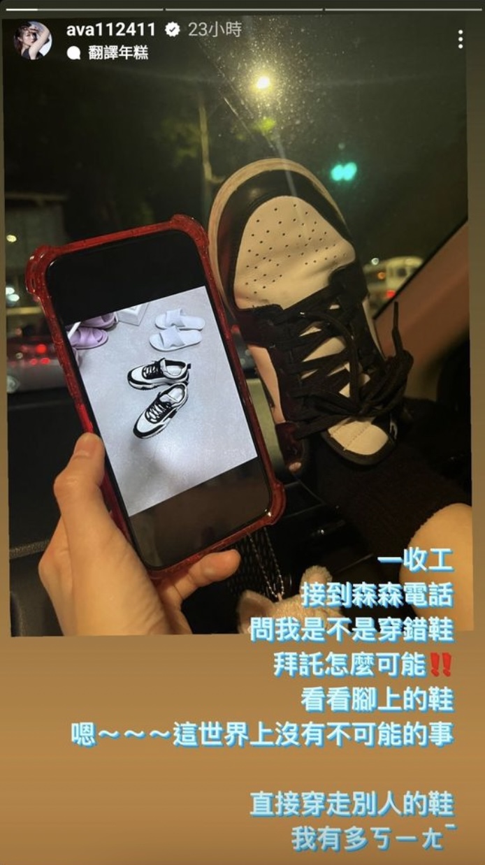 丫頭近日在限時動態中發文坦言,自己在收工之後接到同事的電話,對方鞋子不見正到處在找鞋,而她第一時間也想說「拜託!怎麼可能穿錯鞋子!」殊不知,當她低頭看自己腳上的鞋子時,她正穿著的就是對方在找的那雙黑白鞋!讓她自嘲說,「嗯~這世界上沒有不可能的事,直接穿走別人的鞋,我有多ㄎㄧㄤ?」