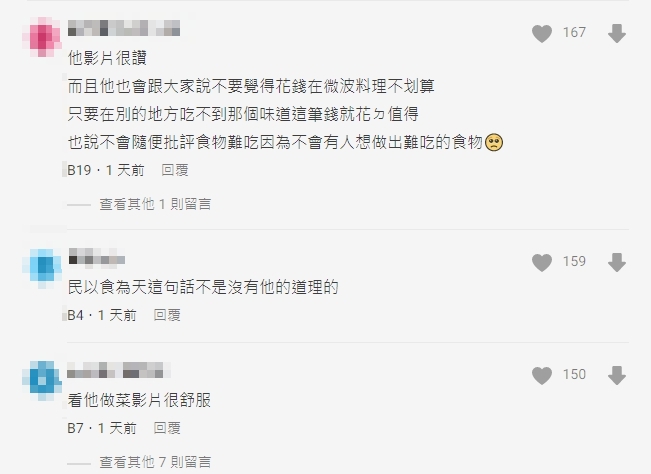 對此,許多網友深有共鳴並表示:「看他評價食物講評言之有物,即使是感覺不太好吃的他也可以很有條理的解釋原因,即使自己身為廚師但對於很多沒吃過的料理都是虛心講評」、「他會在開箱時順便教一些很酷的搭配讓普通的賣場零食或料理包變得更高級」、「有種很尊重料理的氣質!喜歡~」