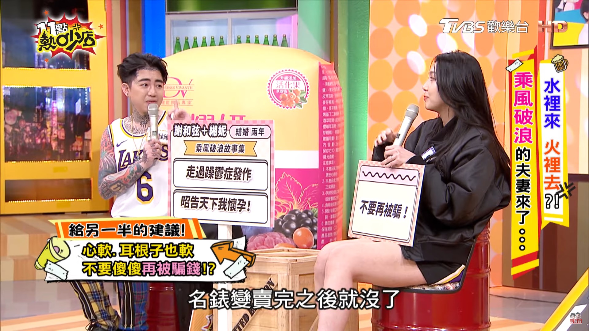 歌手謝和弦與老婆陳緗妮(莉婭)於2021年結婚,並於2022年順產愛女謝音悅,兩人日前在節目《11點熱吵店》聊到夫妻間的故事,緗妮爆料謝和弦很容易「受騙」,就曾發生過有假粉絲聲稱沒錢打官司,騙了他一支勞力士手錶,讓緗妮超傻眼!