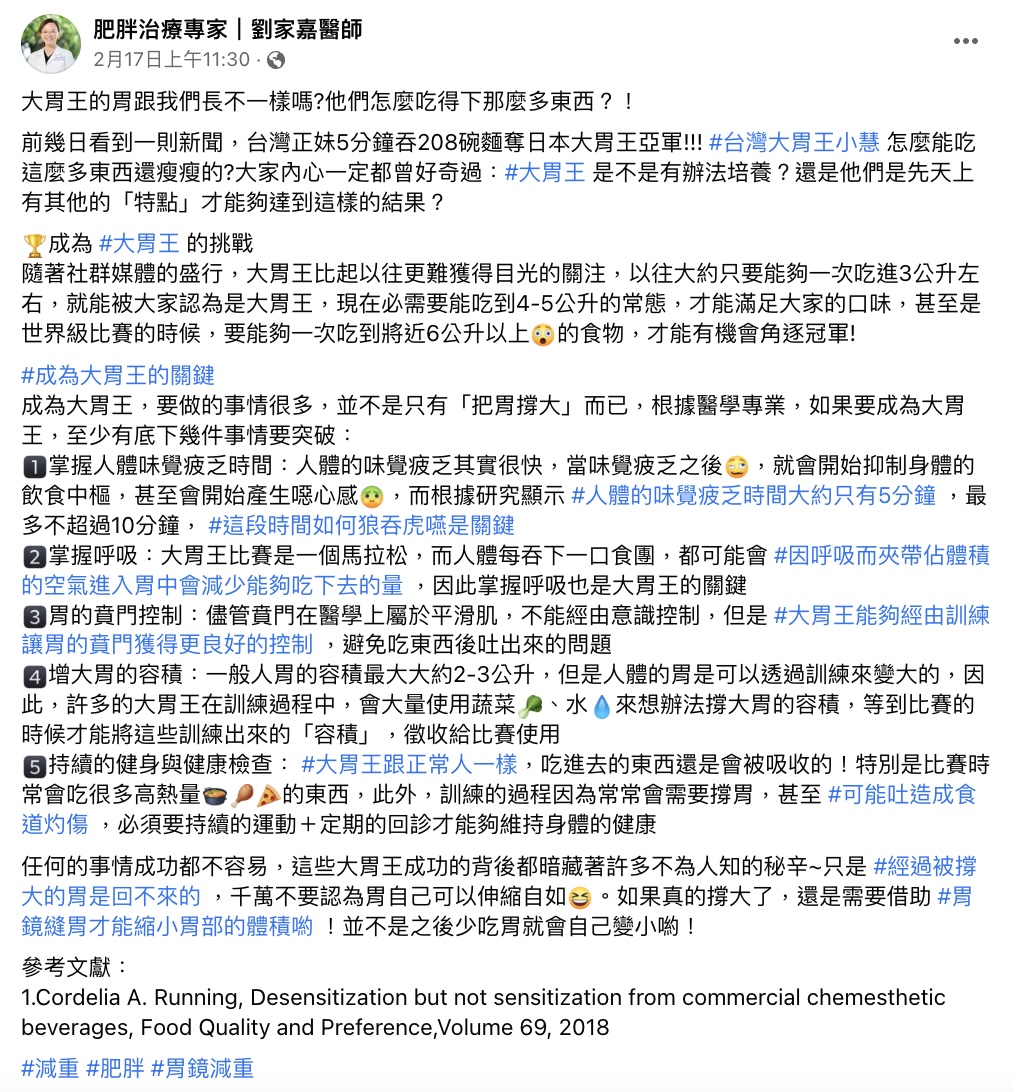 而醫師劉家嘉也在臉書發文提到,隨著社群媒體盛行,大胃王比過去更難獲得關注,「以往大約只要能一次吃進3公升左右,就能被大家認為是大胃王,但現在必需要能吃到4-5公升的常態,才能滿足大家,甚至在世界級比賽的時候,要能夠一次吃到將近6公升以上的食物,才能有機會角逐冠軍!」