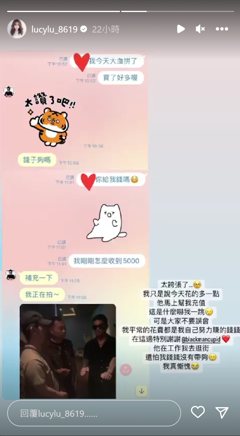 Lucy 21日在IG限時動態曬出與黑男的對話紀錄,她先是向對方分享今天的行程,「我今天大血拼了,買了好多喔。」黑男便主動關心錢是否夠用,沒想到Lucy接著就發現男友匯款5000元到自己的戶頭,但黑男不但沒有邀功,反而若無其事地報備正在拍攝,男友力十足!