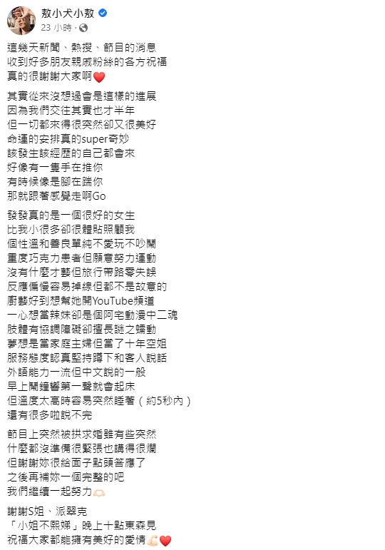 雖然在節目上事發突然地被拱求婚,「什麼都沒準備很緊張也講得很爛,但謝謝妳很給面子點頭答應了,之後再補妳一個完整的吧!我們繼續一起努力~」而根據《ETtoday》報導,敖犬經紀人表示:「因交往才不到8個月,但確實是奔著結婚交往,只是被小S打亂節奏,提早訂下,敖犬是真心的,只是有點歉疚心疼發發,被在這樣倉促環境下求婚!日後再私下補給女友,不過結婚的話還早!」
