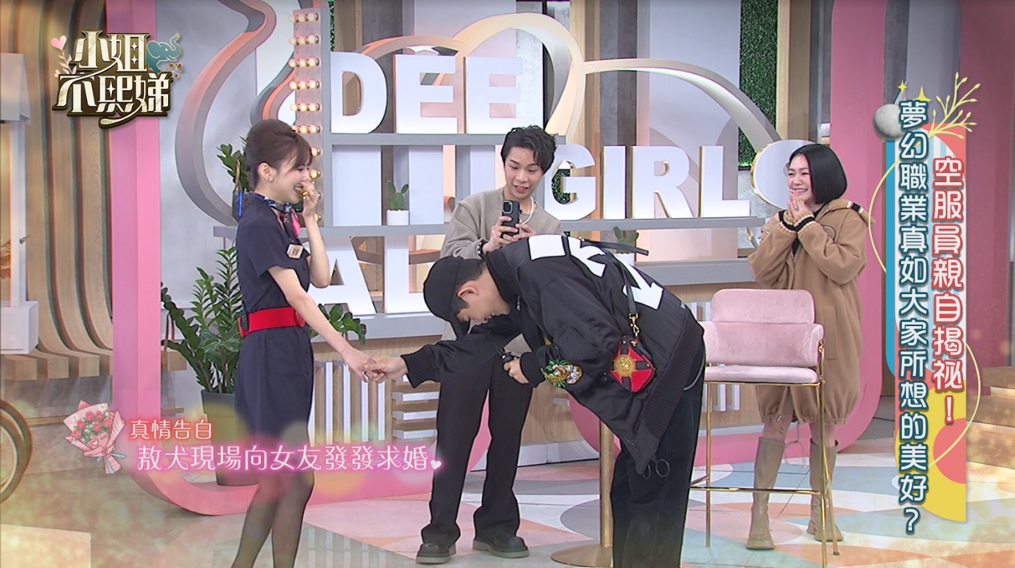 事實上,敖犬在節目上透露雙方還沒聊過結婚的話題,但如果感情穩定且女友有意願地話,會有意願定下來。小S見狀便拱他求婚,敖犬則當場單膝下跪,並真誠地表示:「可以跟妳在一起是一件很幸福的事情,如果妳覺得我還不錯的話,希望我們可以在一起一輩子,妳願意嫁給我嗎?」眾人聽了都相當感動。