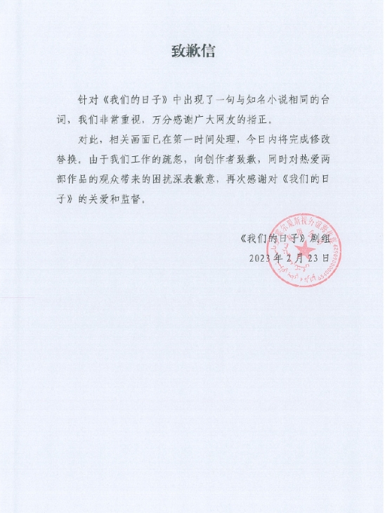 對此,《我們的日子》方面也發文致歉,「針對《我們的日子》中出現了一句與知名小說相同的台詞,我們非常重視,萬分感謝廣大網友的指正。對此,相關畫面已在第一時間處理,今日內將完成修改替換。」坦言事情會鬧大是因為自身工作疏忽,不僅向創作者道歉,也向這兩部作品的粉絲道歉,然而網友仍不買單,痛批「一點點的誠意都感受不到」。